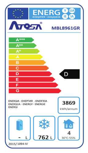 Drzwi pełne; Kl. energ.: D; Poj.: 1300L (762L netto); Najtańsza szafa mroźnicza 1300L atosa